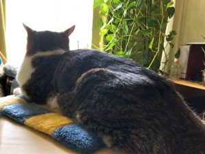 仕事から帰ってくると、いつものオットマンの上にはおらず、違う場所から「にゃーん(お帰り~)」と言ってきてびっくりしたのですが…窓際のオットマンの上は、次男猫のお気に入りの場所です。
